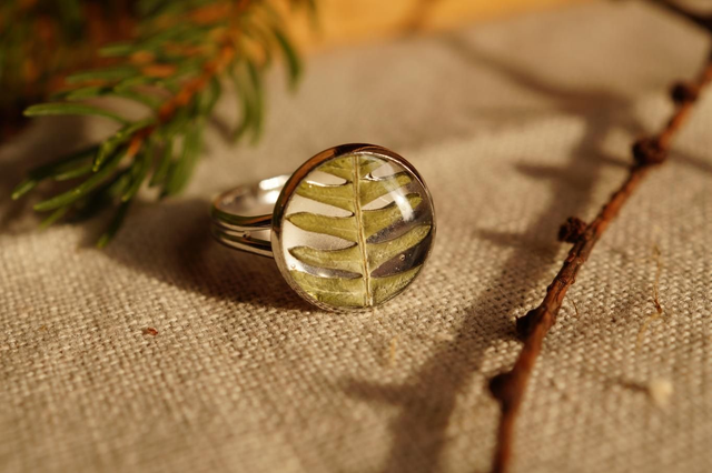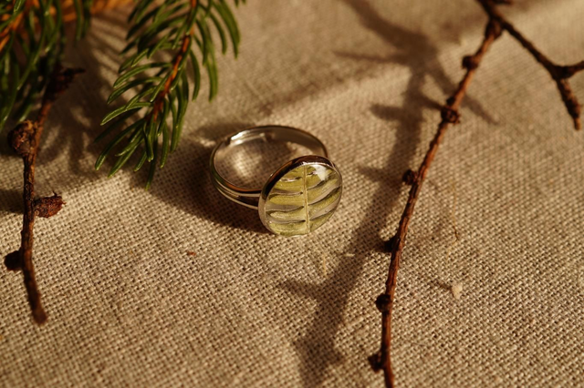 Bague réalisée sur un support argenté, avec une inclusion de feuilles ou d'écorces cueillis à la main puis séchées sous presse manuelle en Corrèze.