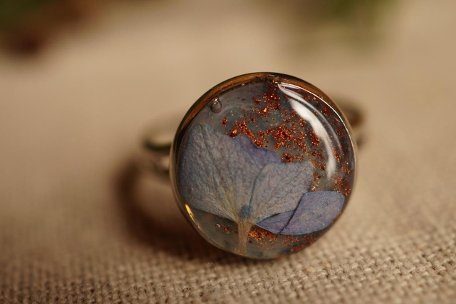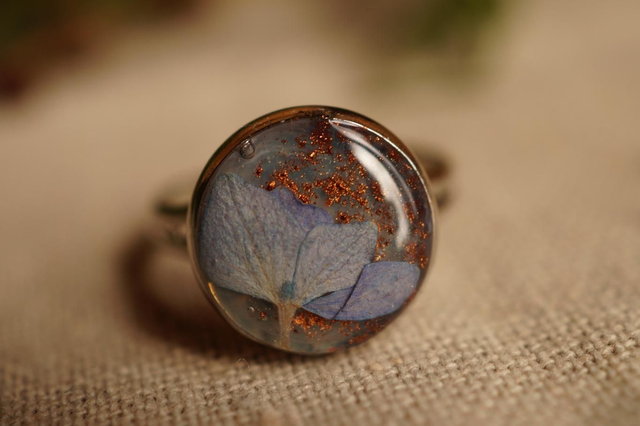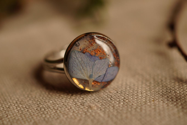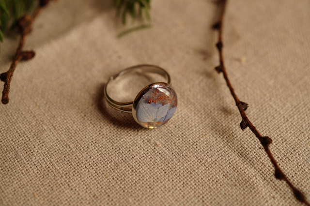 Bague réalisée sur un support argenté, avec une inclusion de feuilles ou d'écorces cueillis à la main puis séchées sous presse manuelle en Corrèze.