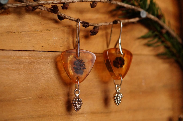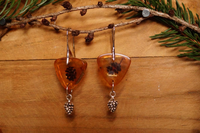 Boucles d'oreilles composées d'une pièce de résine triangulaire aux bords arrondis, sur laquelle vient se balancer une breloque en en forme de pomme de pin. Le crochet fin et élégant vient rallonger le pendant. C'est une paire délicate, soignée et originale !