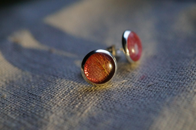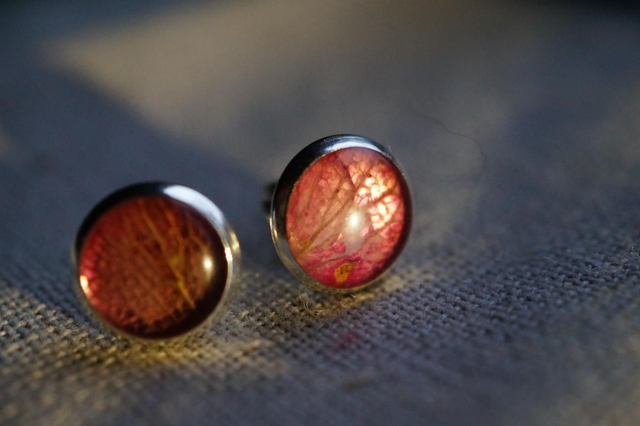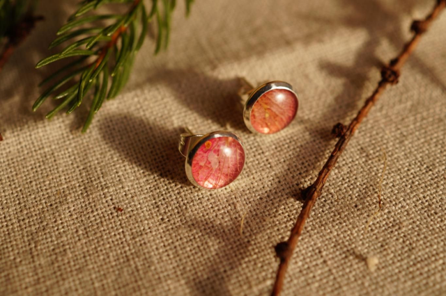 Paire de clous d'oreilles, avec une inclusion de feuille, de pétale ou d'écorce. Les végétaux sont cueillis à la main en Corrèze, puis séchés sous presse avant d'être travaillés sous résine.