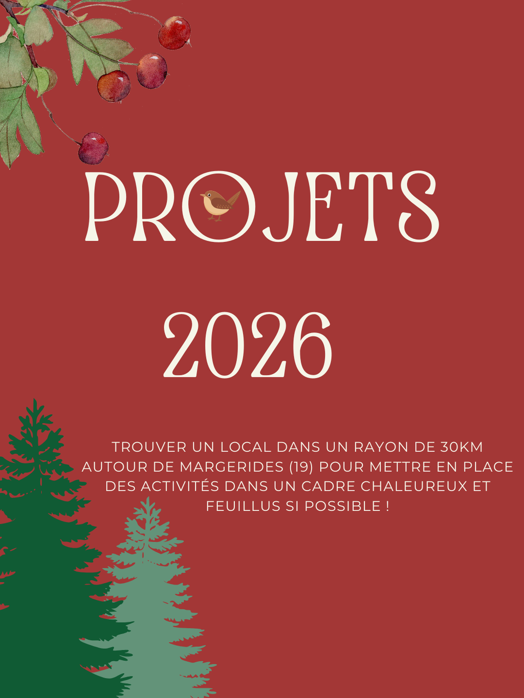 L'objectif numéro un pour les prochaines années est de trouver un local dans un rayon de 30km autour de Margerides (19) pour mettre en place des activités dans un cadre chaleureux et feuillus si possible ! C'est pourquoi l'association a mit en place dès novembre 2024 la fabrication, grâce à Margaux, de bijoux en résine et fleurs séchées, mais aussi de la déco, en vente sur les marchés. Les bénéfices servent pour le moment à financer du matériel de bricolage (pistolet à colle, résine, moule…) et prochainement à louer un local.
