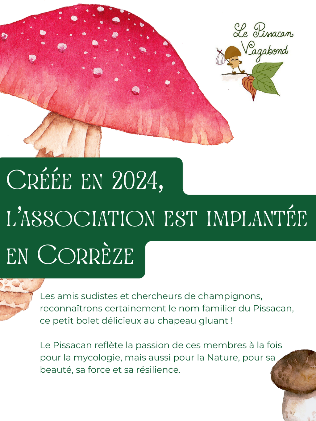 Les amis sudistes et chercheurs de champignons, reconnaîtrons certainement le nom familier du Pissacan, ce petit bolet délicieux au chapeau gluant ! Le Pissacan reflète la passion de ces membres à la fois pour la mycologie, mais aussi pour la Nature: pour sa beauté, sa force et sa résilience. Comme elle, l'association se veut foisonnante d'activités, c'est pourquoi elle porte fièrement la devise suivante : éditer, créer et récolter des idées aux cœur de la Nature.