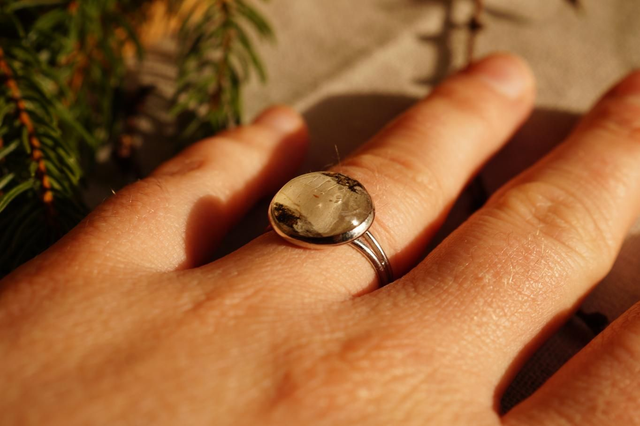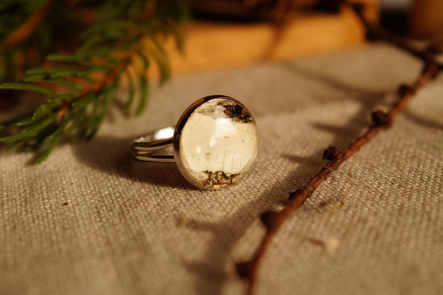Bague réalisée sur un support argenté, avec une inclusion de feuilles ou d'écorces cueillis à la main puis séchées sous presse manuelle en Corrèze.